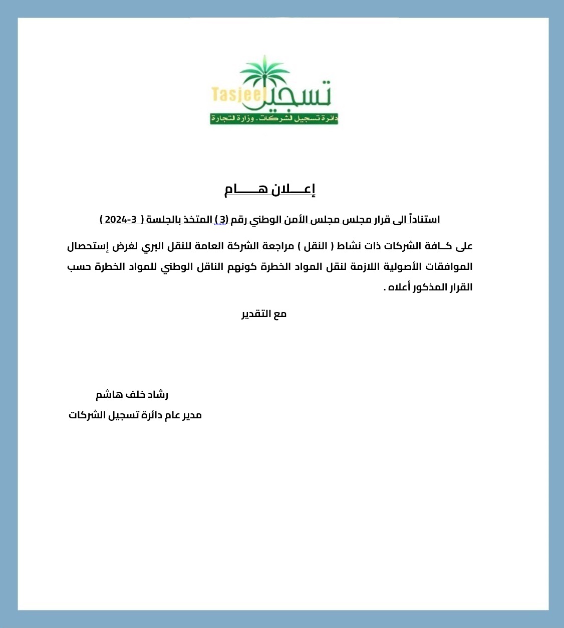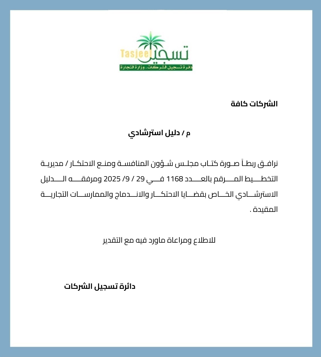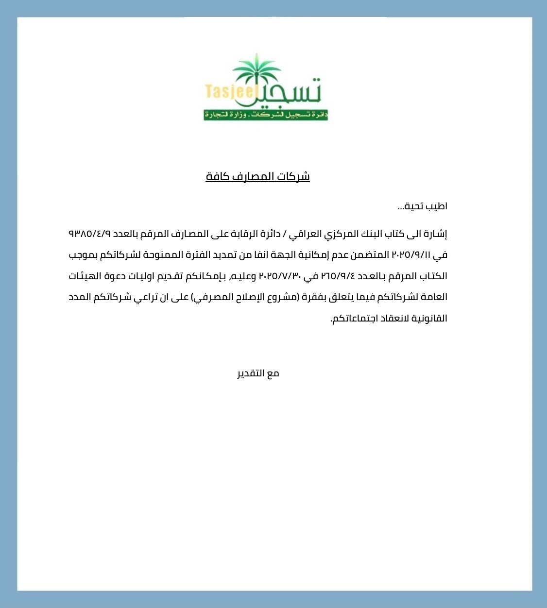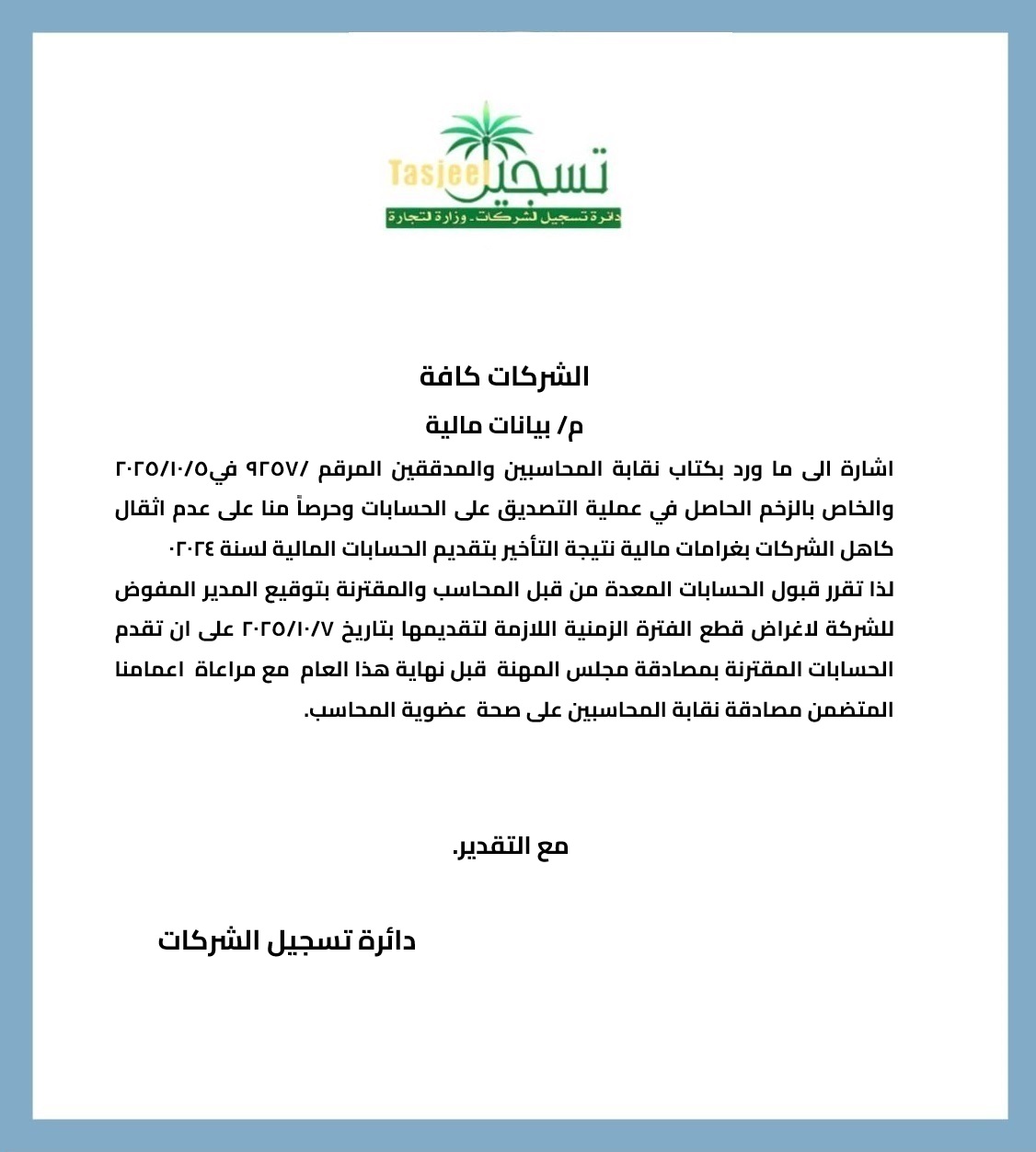 على مواقع التواصل جميع الحقوق محفوظة© لدائرة تسجيل الشركات-2024 عن الدائرة: دائرة تسجيل الشركات من اهم الدوائر في وزارة التجارة المختصة بتسجيل ومتابعة الشركات العراقية والاجنبية و مقرها في بغداد المنصور- شارع دمشق