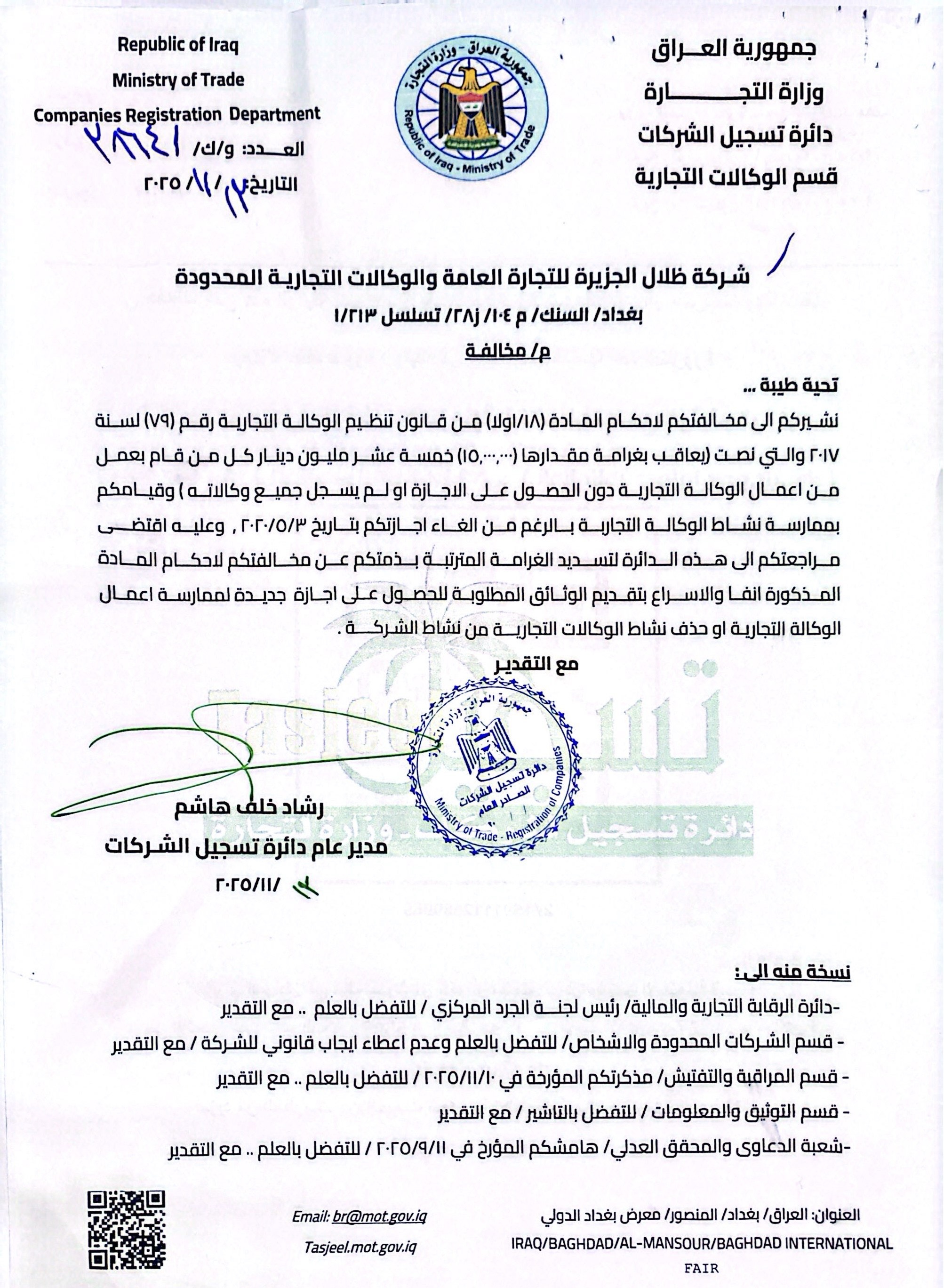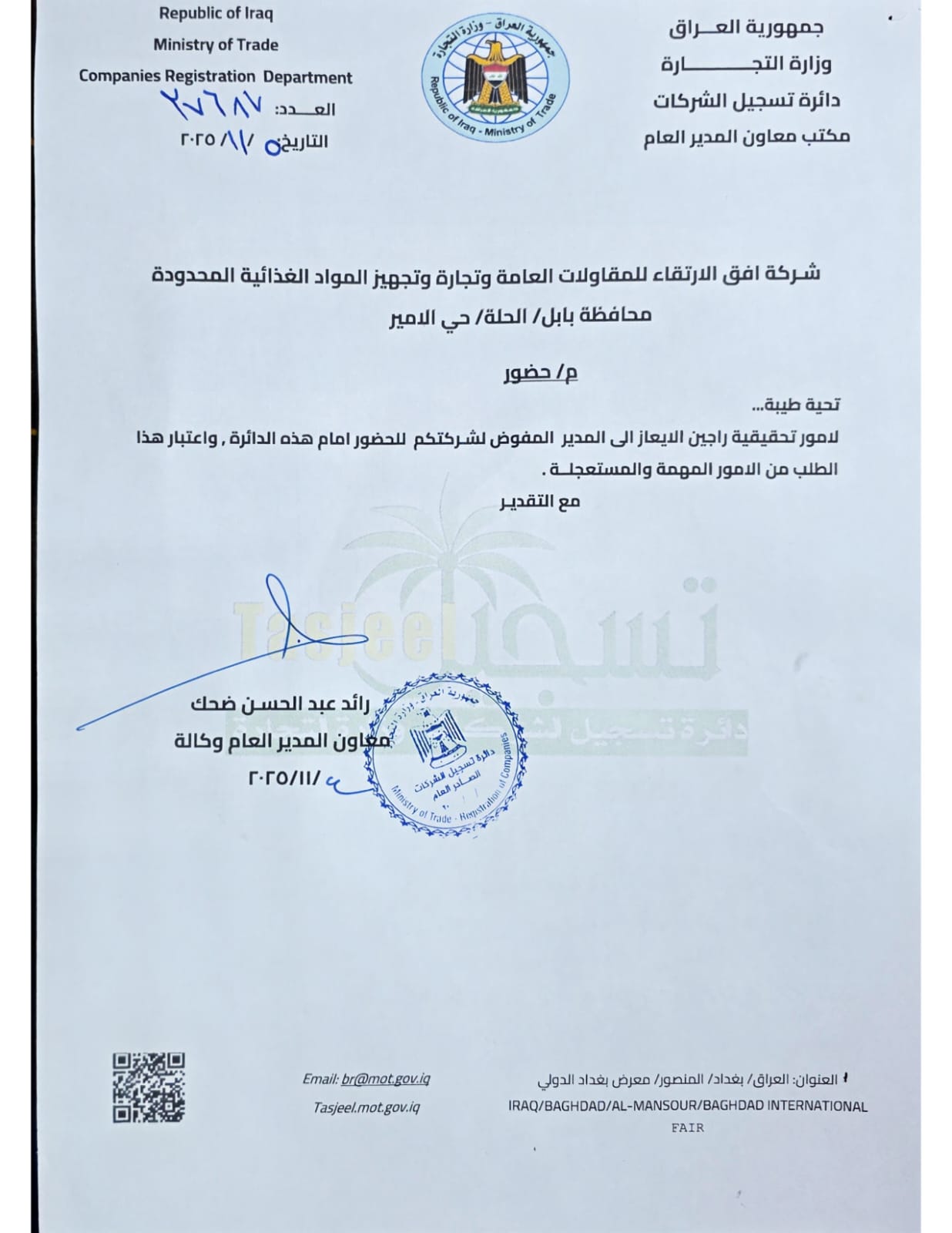 اشعار- شركة مدار دجلة للتجارة العامة و الوكالات التجارية و الخدمات العامة المحدودة