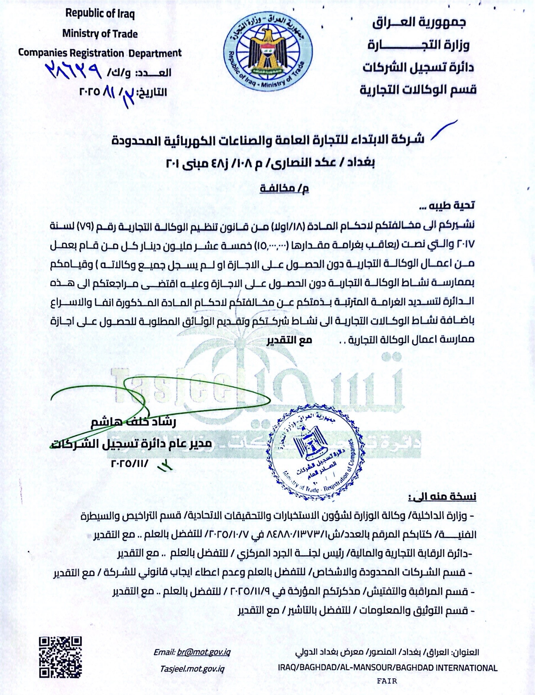 مخالفة - شركة الابتداء للتجارة العامة و الصناعات الكهربائية المحدودة