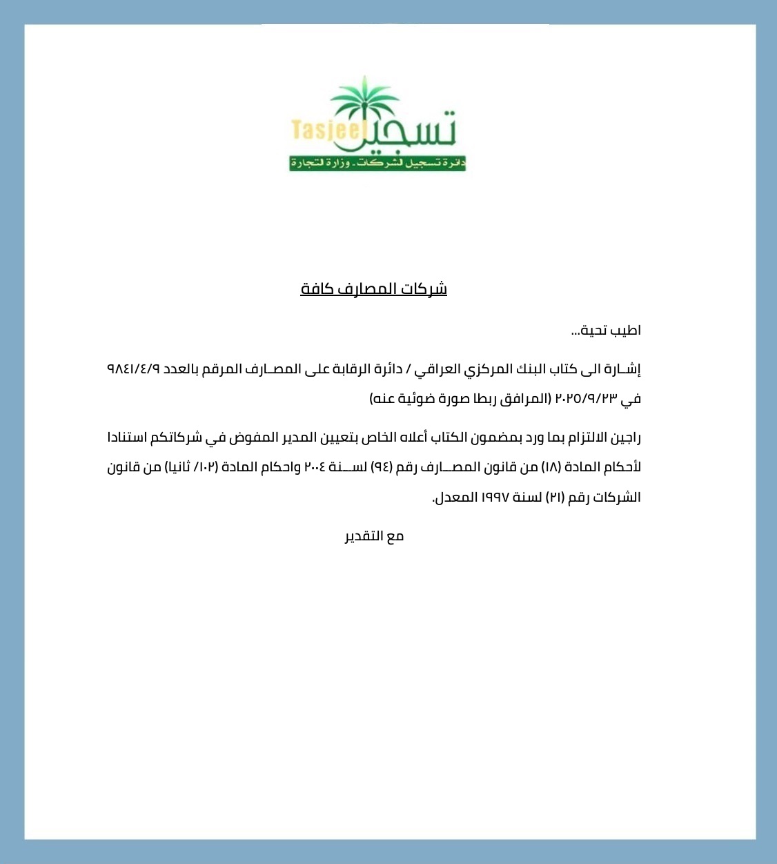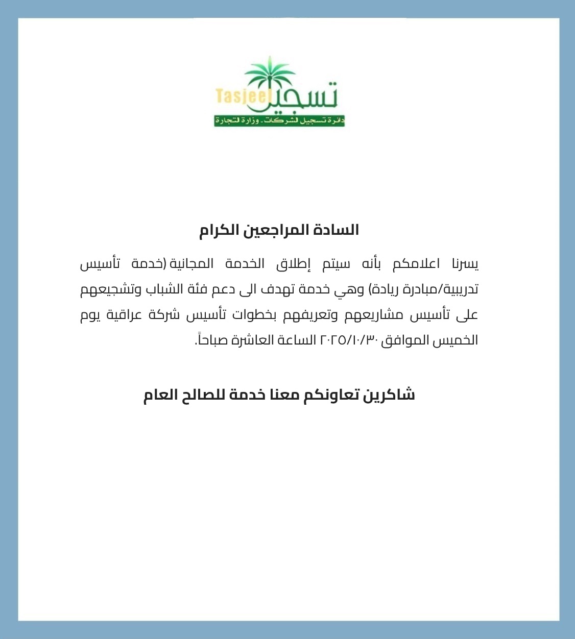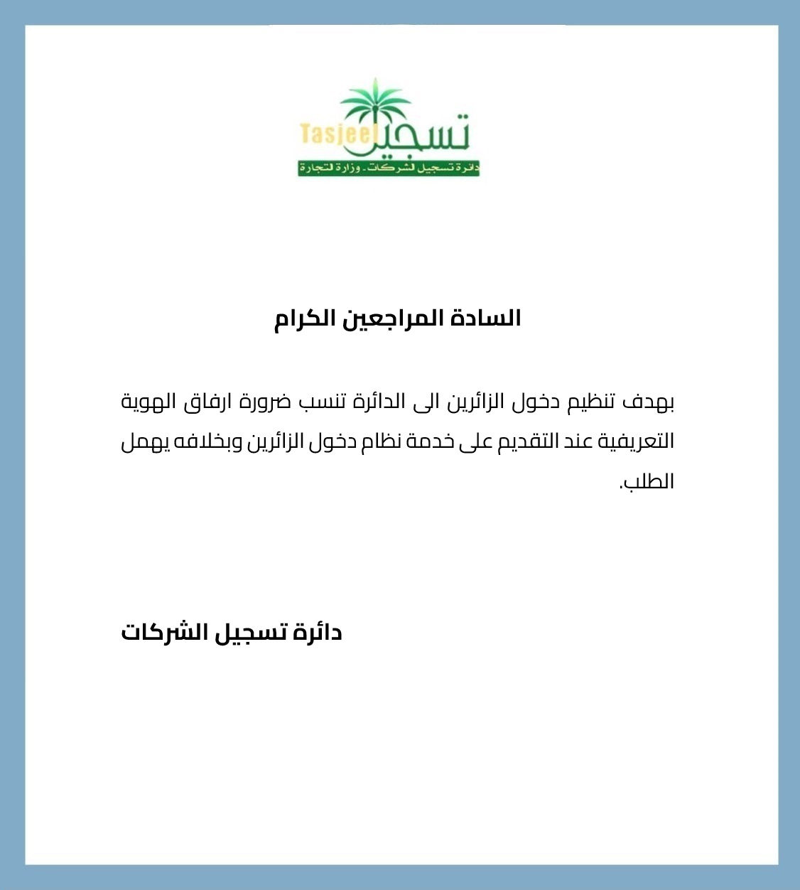 على مواقع التواصل جميع الحقوق محفوظة© لدائرة تسجيل الشركات-2024 عن الدائرة: دائرة تسجيل الشركات من اهم الدوائر في وزارة التجارة المختصة بتسجيل ومتابعة الشركات العراقية والاجنبية و مقرها في بغداد المنصور- شارع دمشق